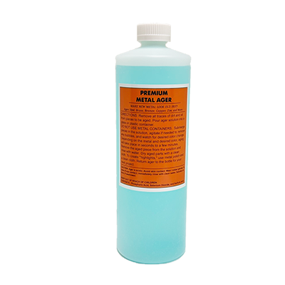 Directions: Clean your metal parts of dirt and oil. Wear gloves so you do not leave fingerprints on the metal. You can use acetone to get parts completely clean if necessary. Empty the ager into a glass or plastic container. Submerge the parts to be aged. The aging will take place quickly so watch the process. When you have achieved the patina you are looking for remove and rinse with tap water. You can also have a dish with water to move small pieces into as they finish. Remove parts from the water and dry with a clean towel. Some of the antique finish will come off during the drying process which is OK. If you want a darker finish, repeat the aging process described above. If the piece is darker than desired or you prefer highlights, use a metal polish and soft cloth to achieve the desired finish. Steel wool can be used as well to create highlights on the finished piece. Return the ager to the bottle for future projects. When aging slows the product is nearing the end of its aging ability.